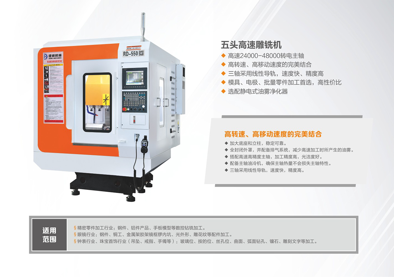 新型環(huán)保數(shù)控CNC -高速雕銑機(jī)采用高速24000-48000轉(zhuǎn)電主軸,選配靜電式油霧凈化器,三軸采用線性導(dǎo)軌,速度快,精度高,是模具、電極、批量零件加工;采用臺(tái)灣新代或臺(tái)灣寶元控制系統(tǒng),日本YASKWA電機(jī)及驅(qū)動(dòng),臺(tái)灣上銀、銀泰導(dǎo)軌及滾珠絲桿,華雕精密主軸,是高轉(zhuǎn)速、高移動(dòng)速度的結(jié)合。